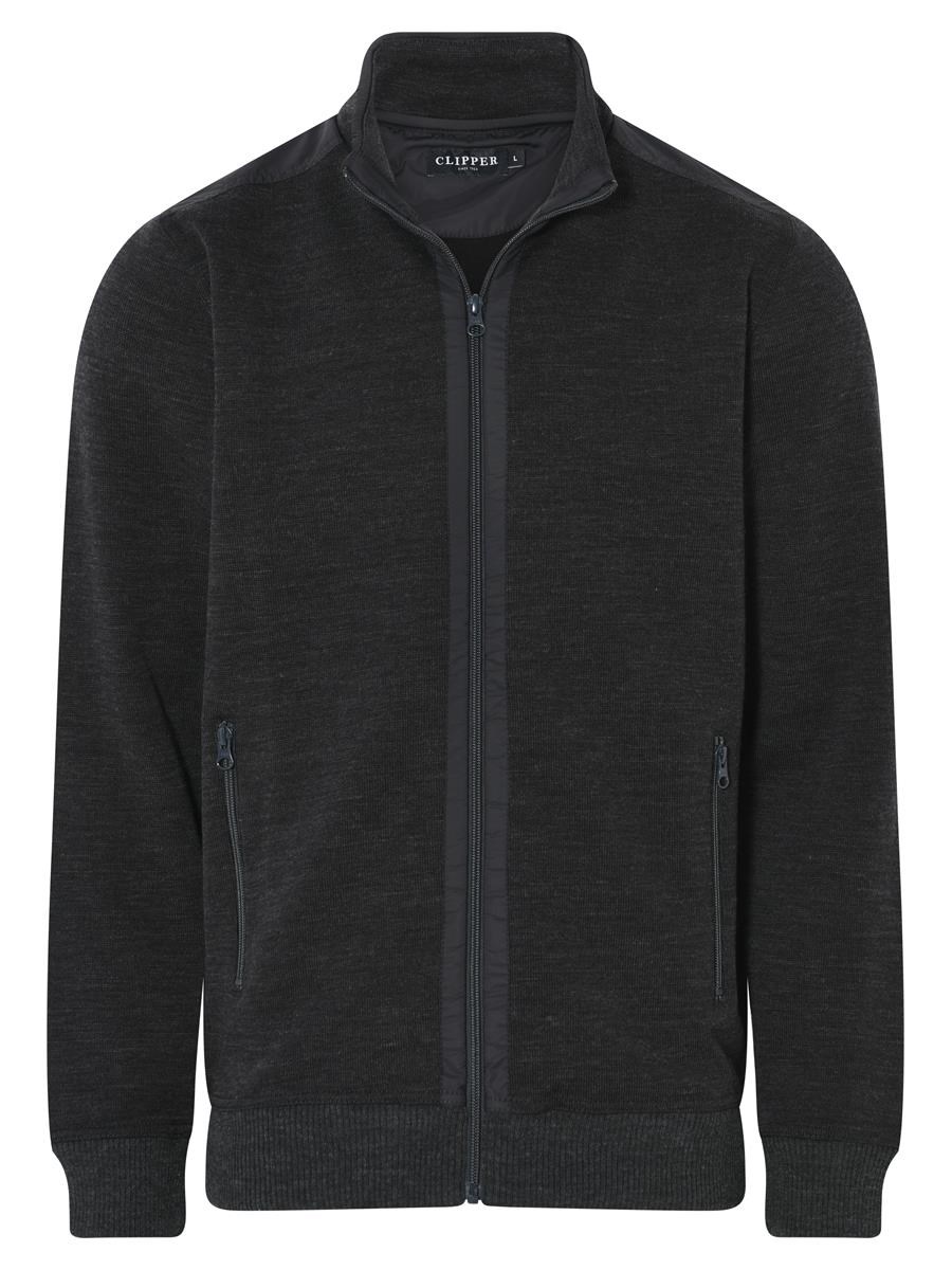 Cardigan med lynlås og to sidelommer med lynlås. Rib forneden og ved ærmer.