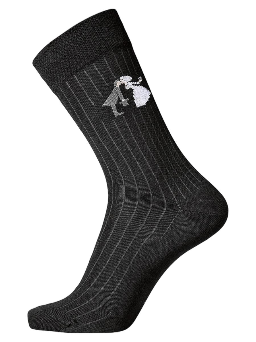 Bryllups strømper fra Egtved i en rigtig lækker og behagelig bomuldskvalitet. Ensfarvet sort, med billed af et brudepar samt klippesnor. Findes i størrelserne 40-45 og 45-48.